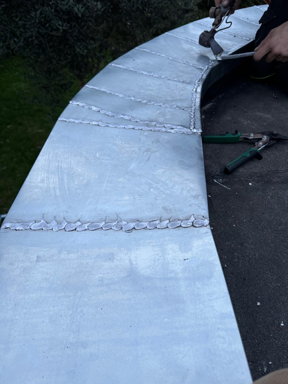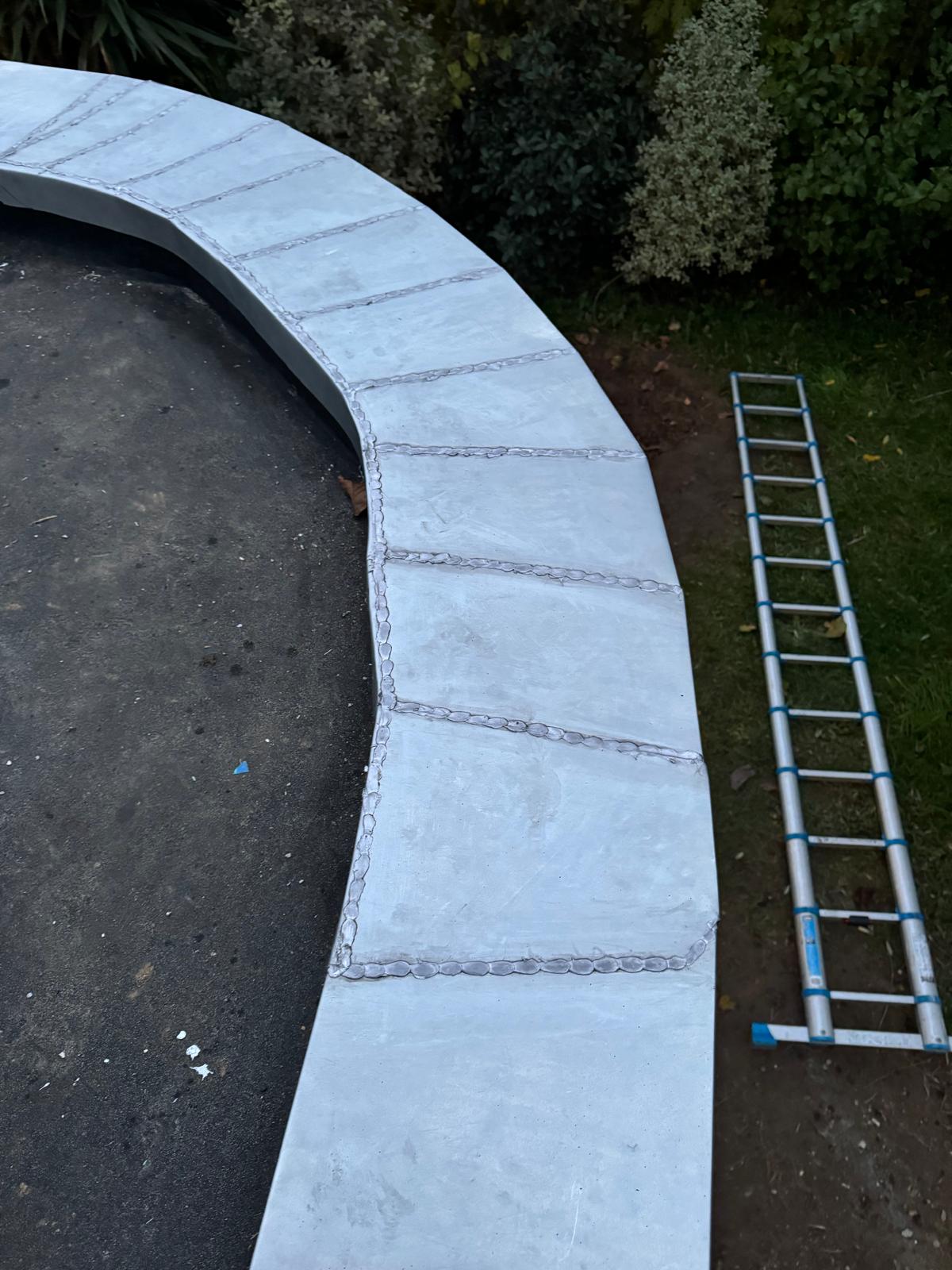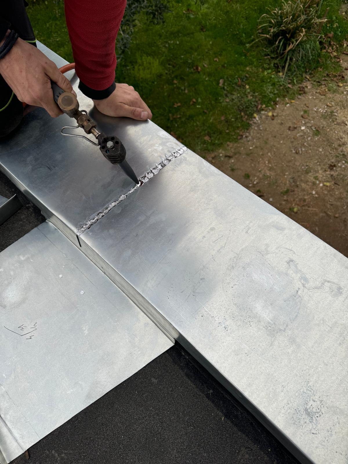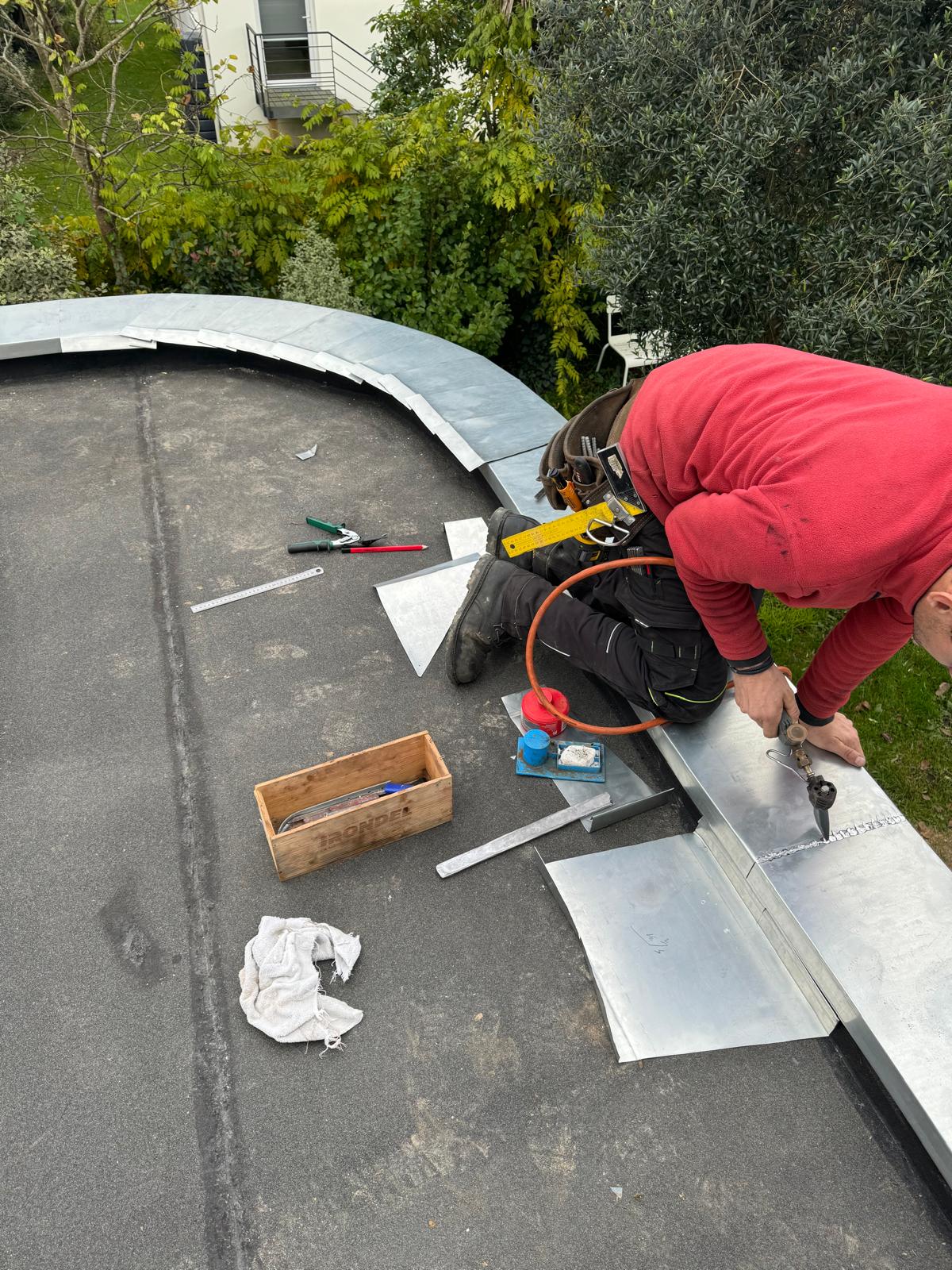 Pour ce chantier, des pièces de zinc sur-mesure ont été préparées puis soudées avec précision afin d’épouser parfaitement la forme du mur et garantir une étanchéité optimale. En plus de son rôle protecteur, la couvertine apporte une finition élégante et moderne qui valorise l’esthétique de la maison.